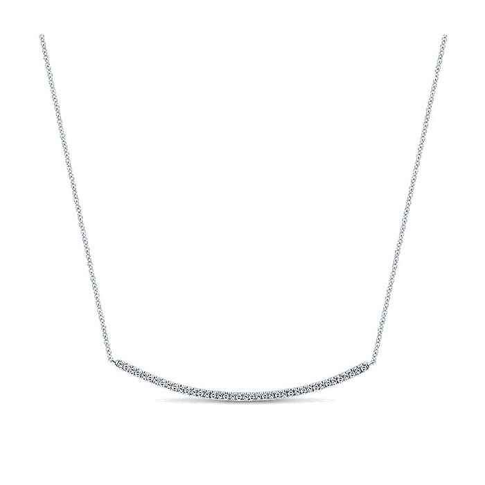 This tasteful white gold fashion necklace features a single curved bar of sparkling diamonds