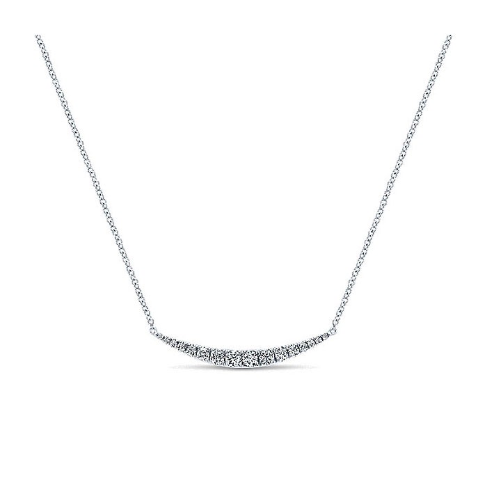 This distinctive curved bar necklace features a tapered array of round diamonds
