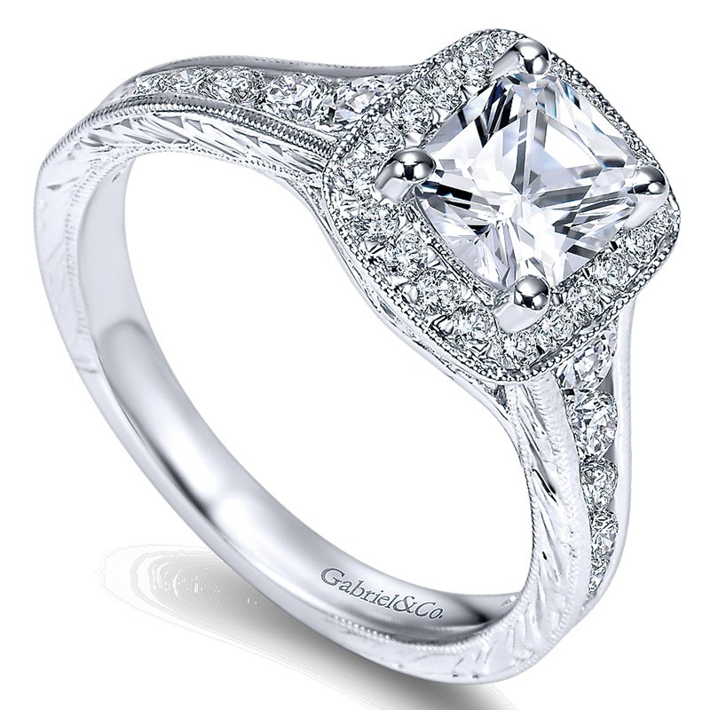 ER8793W44JJ Engagement Ring 14k White Gold Diamond Halo Channel and Milgrain 14k White Gold