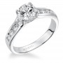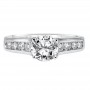 Diamond engagement ring with round center stone pave set round diamonds under the setting and channel set round diamonds down the shoulders of the band