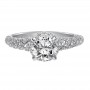 Diamond engagement ring with round diamond halo and open air and diamond enhanced shank design.