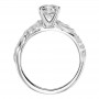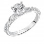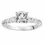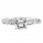 Diamond engagement ring with round center and a satin finished floral carving detail highlighted with diamonds