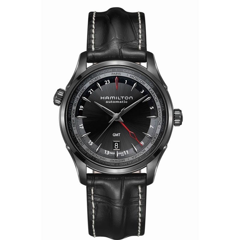 Travel is ultra-cool with this black PVD globetrotter at hand. Mastering the time across 24 time zones, the Jazzmaster GMT Limited Edition uses contrasting grey and bright red elements for easy orientation and visual appeal. Only 999 lucky wearers will be able to obtain this limited edition ticket to freedom.