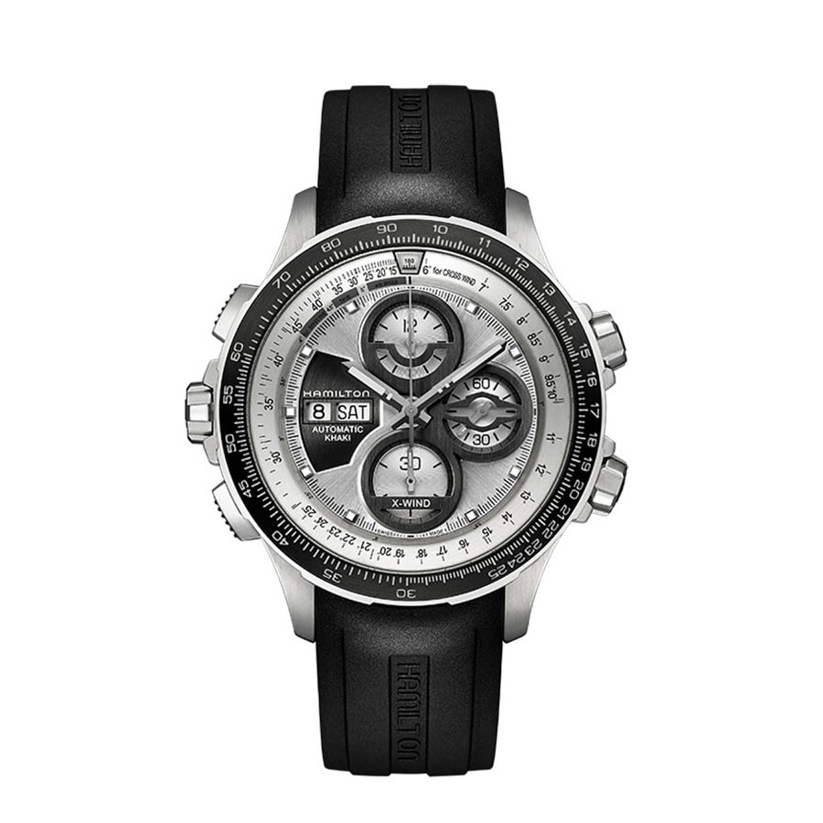In the Khaki X-Wind sophisticated design houses a drift-angle calculator to satisfy the technical and aesthetic demands of all aviation enthusiasts. The dial presents a fascinating 3D effect. With its stepped architecture the multi-level form navigates the eye to its chosen destination whether it's one of the chronograph's three counters the date window at nine o'clock or the surrounding rim and turning bezel with their finely marked digits.
