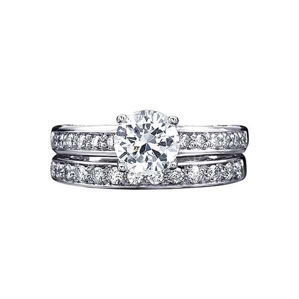 This elegant engagement ring setting is from the Verragio Paradiso Collection. It features pave set round brilliant diamonds on the shoulders to enhance the center stone of your choice. There are nine bezel set round diamonds on the scalloped detail as well.