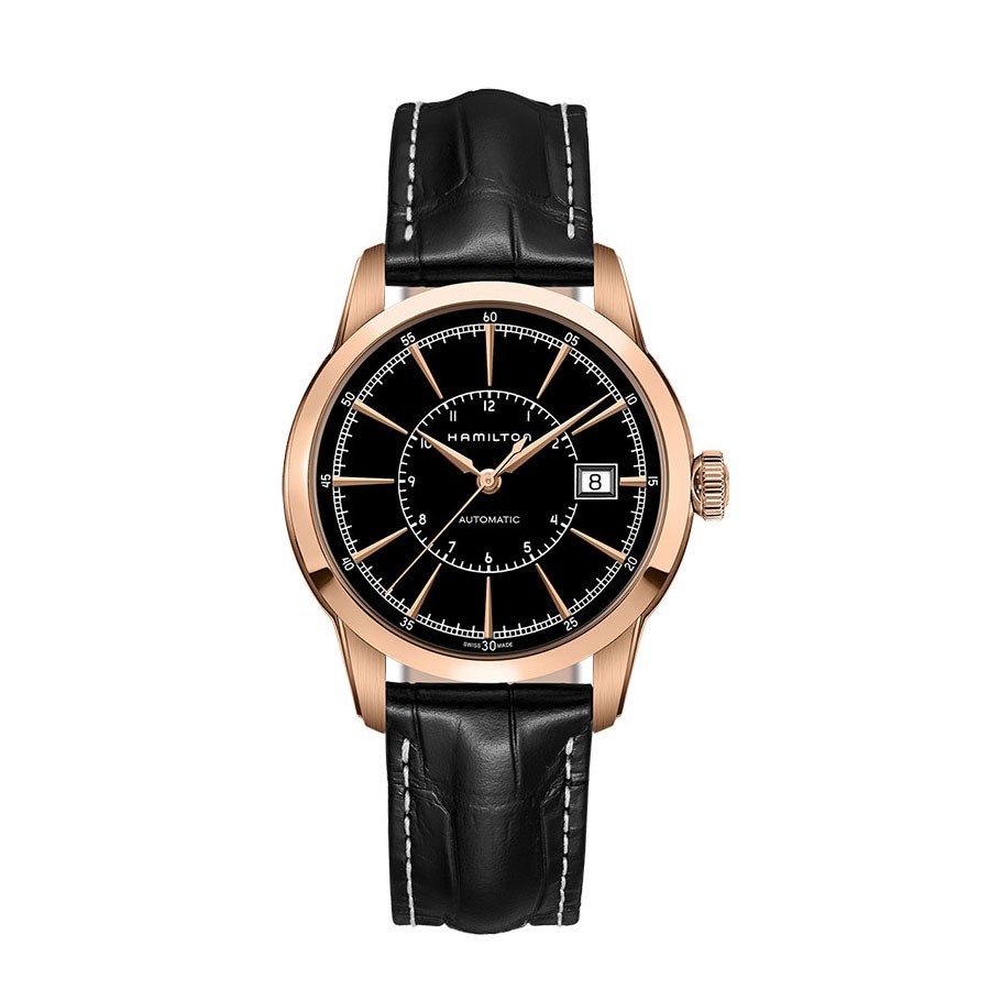 The rounded case of the RailRoad Auto transports the imagination back to the era of pocket watches when Hamilton was âthe Watch of Railroad Accuracyâ. These models hold the exclusive three-hand H-10 movement delivering an 80-hour power reserve and are available in stainless steel or stainless steel with rose PVD finish.