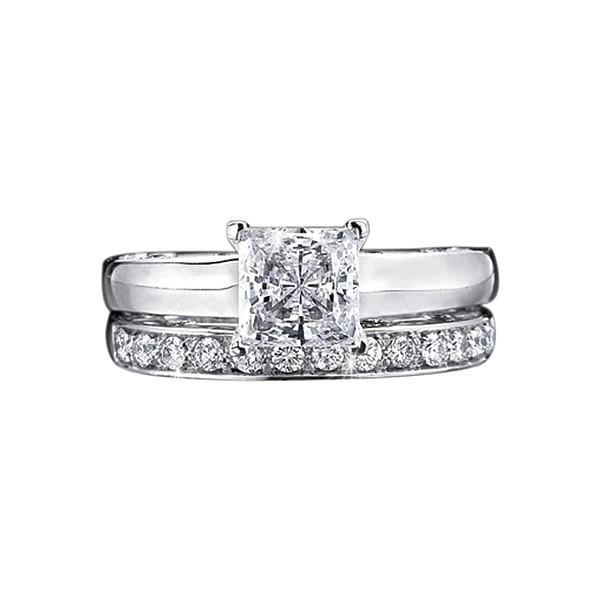 This beautiful solitaire engagement ring setting is from the Verragio Paradiso Collection and features eight bezel set round brilliant cut diamonds and one bezel set princess cut diamond.
