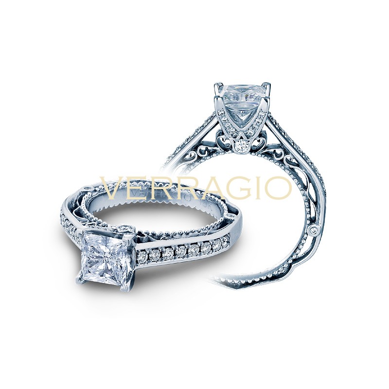 This diamond engagement ring setting by Verragio features round brilliant cut diamonds leading up to the center stone of your choice with Verragio's signature scroll work on the front and back of the ring.