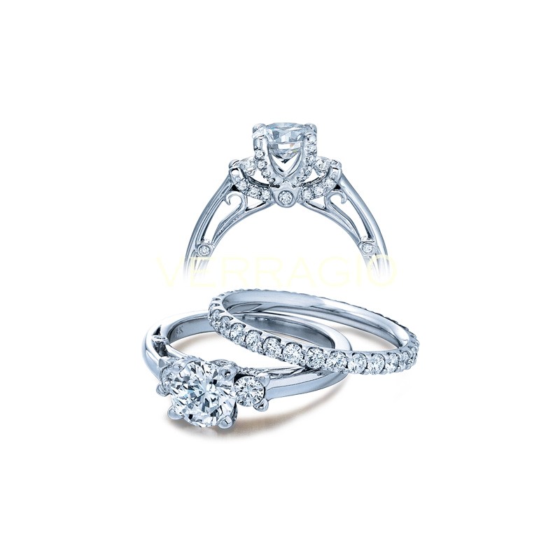 This beautiful engagement ring setting is from the Verragio Couture Collection and it features round brilliant cut diamonds on each prong surrounding the center stone. It also has one round brilliant cut diamond on each side of the center stone of your choice. There is stunning detail throughout the entire setting.